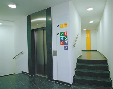 haus handelt. Dem numerischen System der 7 Parkebenen wurde ein Farbsystem an die Seite gestellt, um die Auffindbarkeit des Parkplatzes zu erleichtern.
